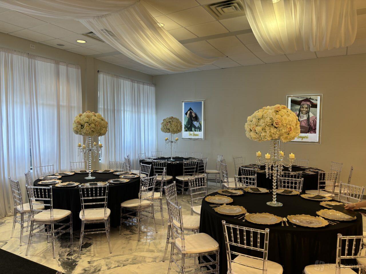 In addition, we offer customizable decoration packages tailored to meet your specific needs. Our Menu of Services includes linens, backdrops, draping, flower walls, green walls, throne chairs, centerpieces, and more.