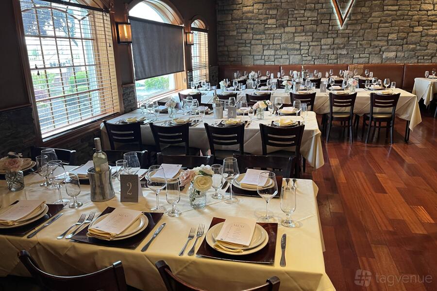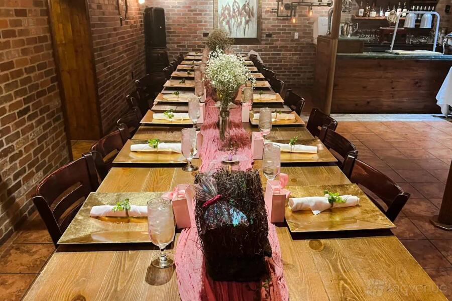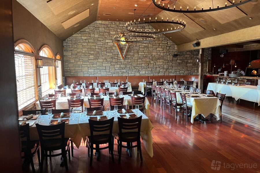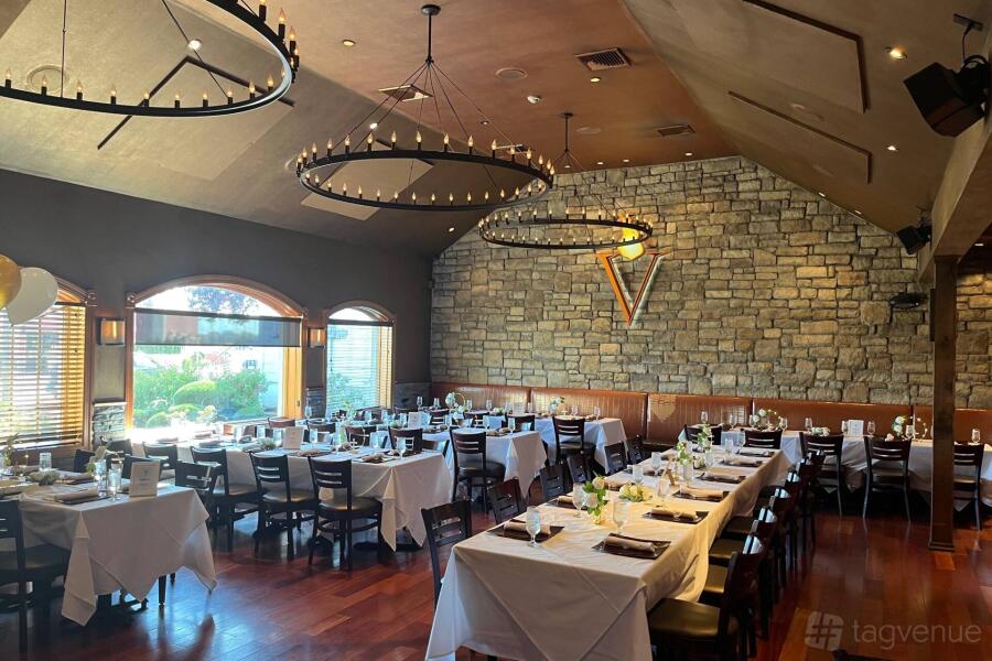 The Chandelier Room at Vesta Wood-Fired offers an elegant space for events, accommodating 30-44 guests for seated dining or up to 60 for cocktail-style gatherings.