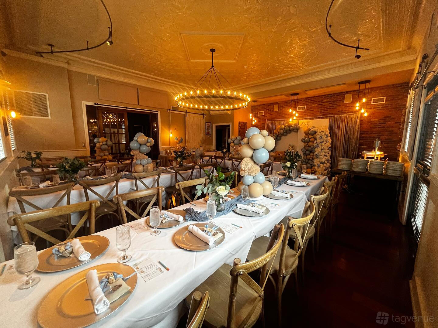 The Chandelier Room at Vesta Wood-Fired offers an elegant space for events, accommodating 30-44 guests for seated dining or up to 60 for cocktail-style gatherings.