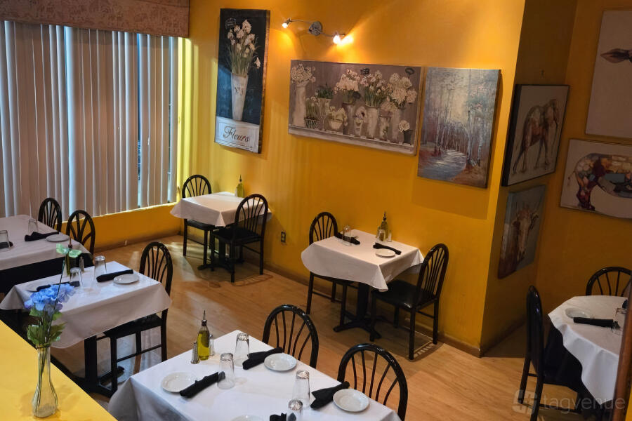 Idylwood Grill & Wine Bar offers a cozy and intimate dining environment. The interior features warm yellow walls adorned with various art pieces and photographs, creating a homely and inviting atmosphere. This space is structured with multiple dining areas, each fitted with comfortable black chairs and white linen-draped tables that give a classic touch to the vibrant setting.