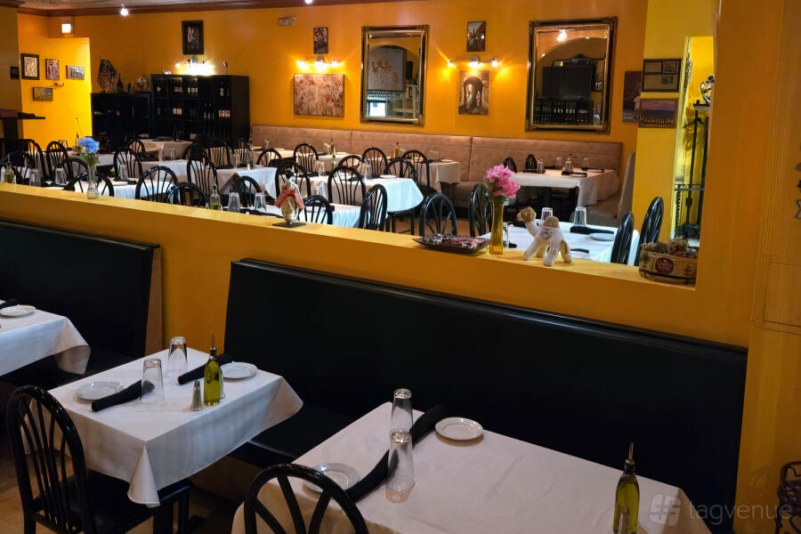 The semi-private section of Idylwood Grill & Wine Bar offers an exclusive retreat within the vibrant atmosphere of the restaurant. This area is characterized by its soft, warm lighting and rich yellow walls adorned with eclectic art pieces, creating an inviting and culturally rich environment. The space features a mix of comfortable booth seating and classic black chairs around white linen-covered tables, allowing for both intimacy and communal dining experiences.