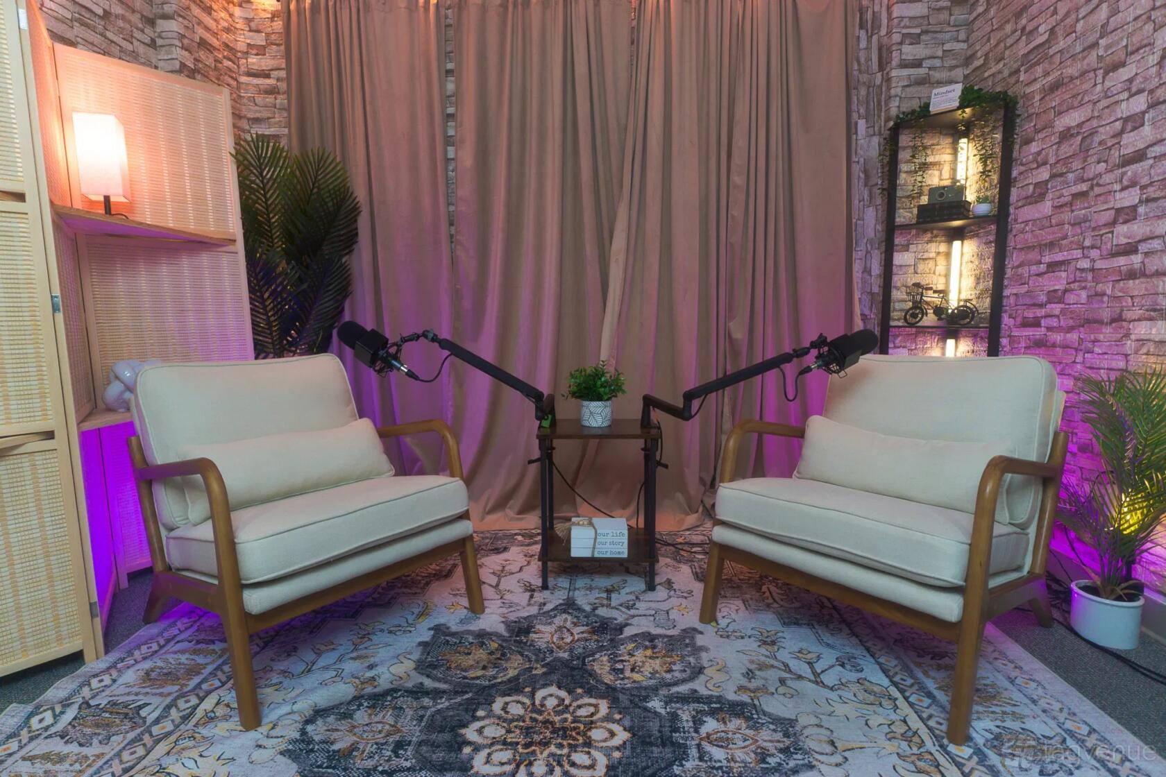 Studio B at Bay Area Podcast Studio can host up to 2 people. The interior features two armchairs with microphones. It's fit for podcast recording.