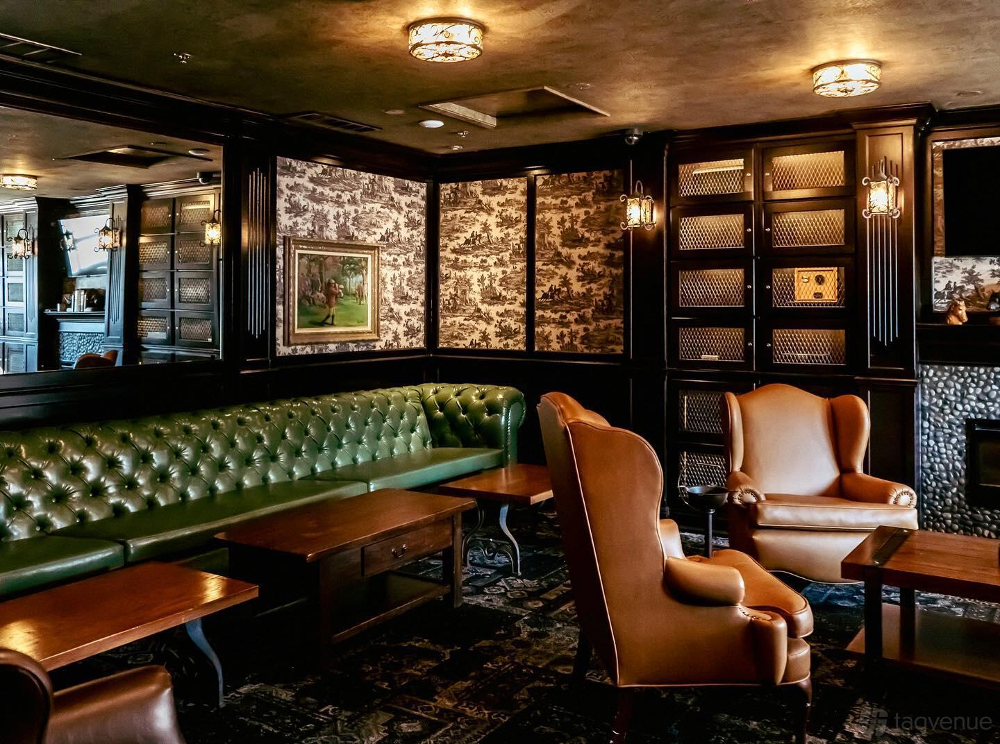 The walls have dark wood and fancy wallpaper with patterns. Enjoy plush green seats and comfy tan chairs where you can relax and chat. The lighting is warm. It’s perfect for small gatherings, book clubs, bachelor/bachelorette parties or serious business talks. Think of it as a place where memories are made over drinks and good company.
