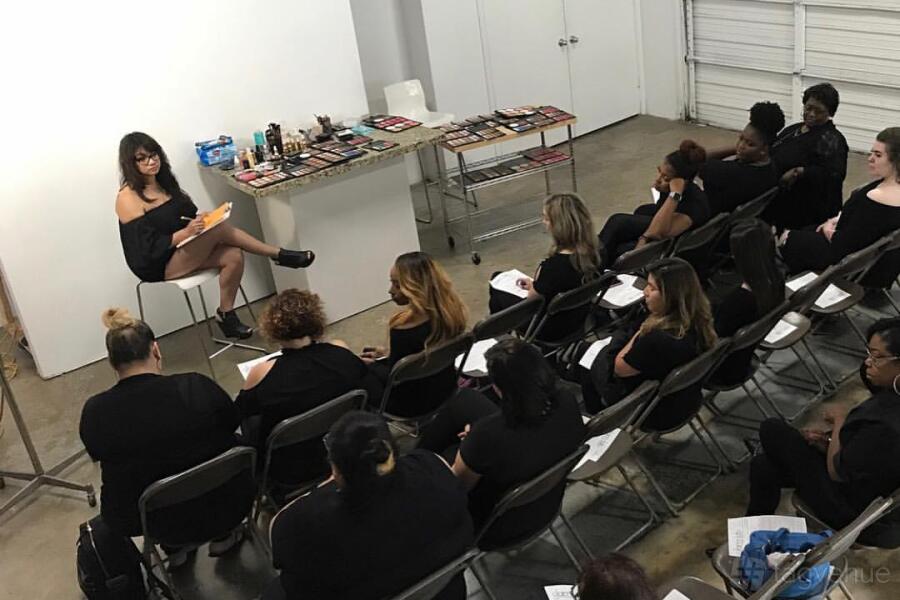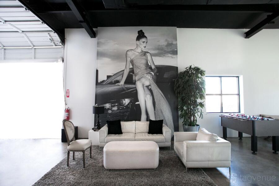Select Studios offers a 12 ft x 12 ft bay door and a 16 ft ceiling, as well as a makeup room, dressing room, kitchen, and reception gallery. Total space is 2400 sq ft.