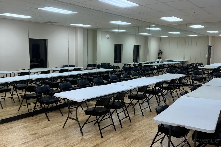 As you step inside, you will discover a venue that caters to a variety of needs. It has been thoughtfully divided into distinct areas to serve the diverse interests of our community. Three fitness rooms stand ready, each offering a unique space with mirrored walls, light wood flooring, and a bright, modern design. These rooms are versatile and perfect for hosting smaller gatherings, whether it's a corporate function or a lively birthday celebration.