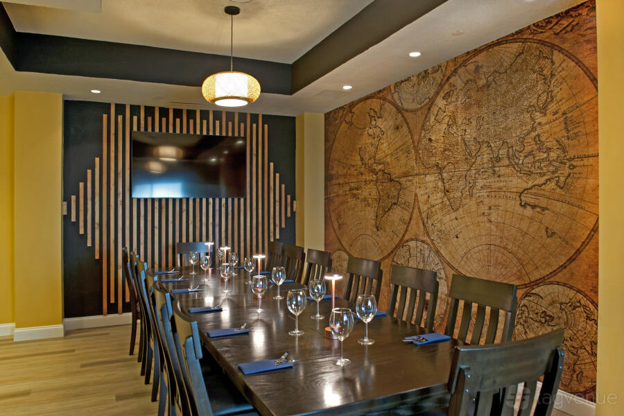 This area is ideal for larger gatherings and includes natural light, air conditioning, and unique art pieces hanging on the walls.