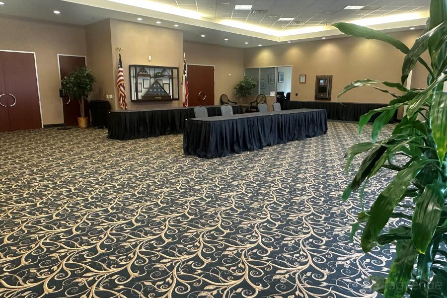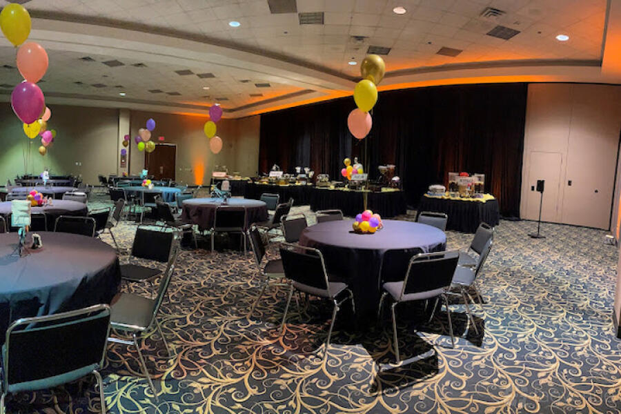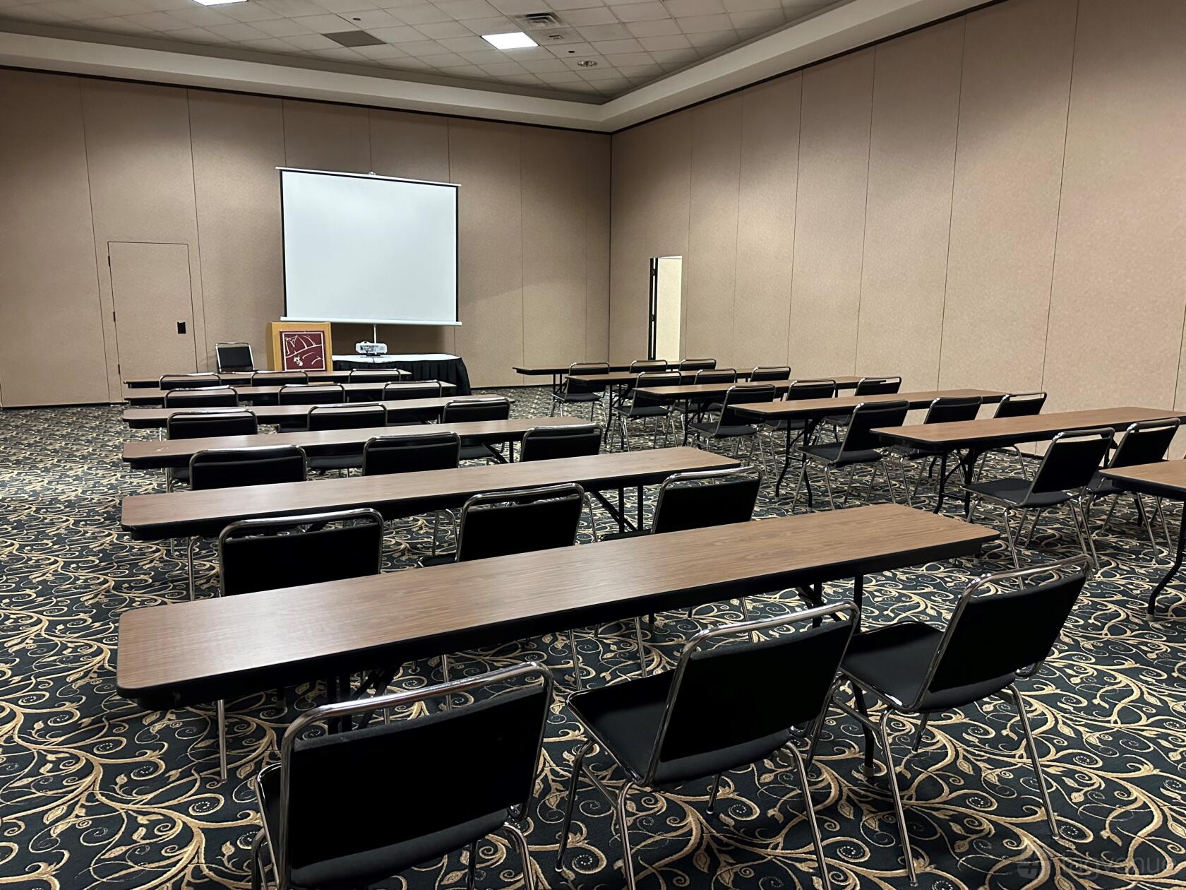 Rental of Section A and/or B includes set up of tables and chairs to an approved diagram, projector, 10' tripod screen, podium, 1 mic, and use of the adjacent foyer space for registration/sign in, refreshments and buffet tables.