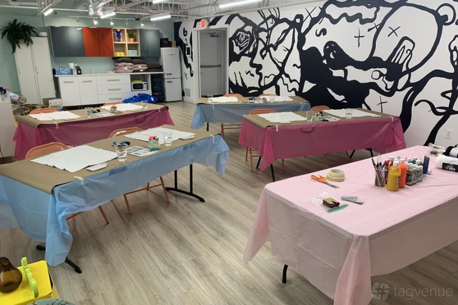 The loft is equipped with practical amenities like a mini fridge, microwave, and Keurig coffee maker with various blends to keep guests refreshed. A unisex bathroom, garment rack, professional clothing steamer, and two multicolored stools make it well-suited for photo shoots and creative projects. High-speed WiFi and a Bluetooth surround sound speaker enhance the experience.