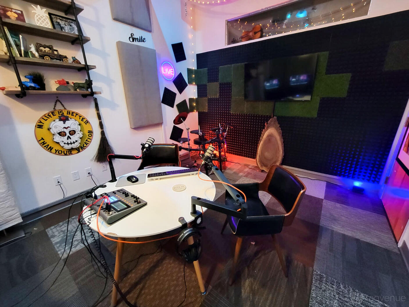 The base rate includes the room, two microphones, and a soundboard, with video available as an add-on. Modifications to the room or the use of external production equipment are not permitted, except for cell phones and their related accessories.