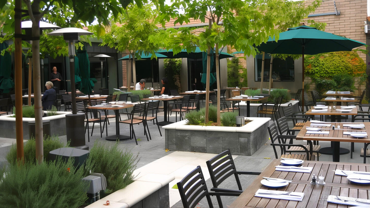 At full capacity, Metro’s fully enclosed patio seats up to 150 guests in a tree-shaded, umbrella-lined, outdoor dining area.