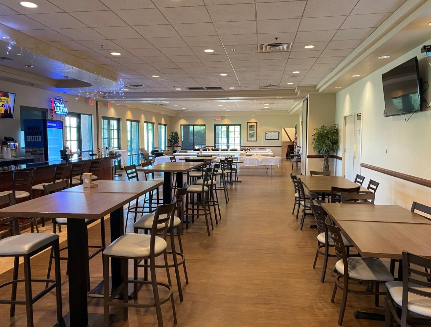 The room combines a main event space and a bar area, accommodating up to 100 attendees. Large windows offer views of the surrounding golf course, creating a scenic backdrop and potential entertainment for guests.
