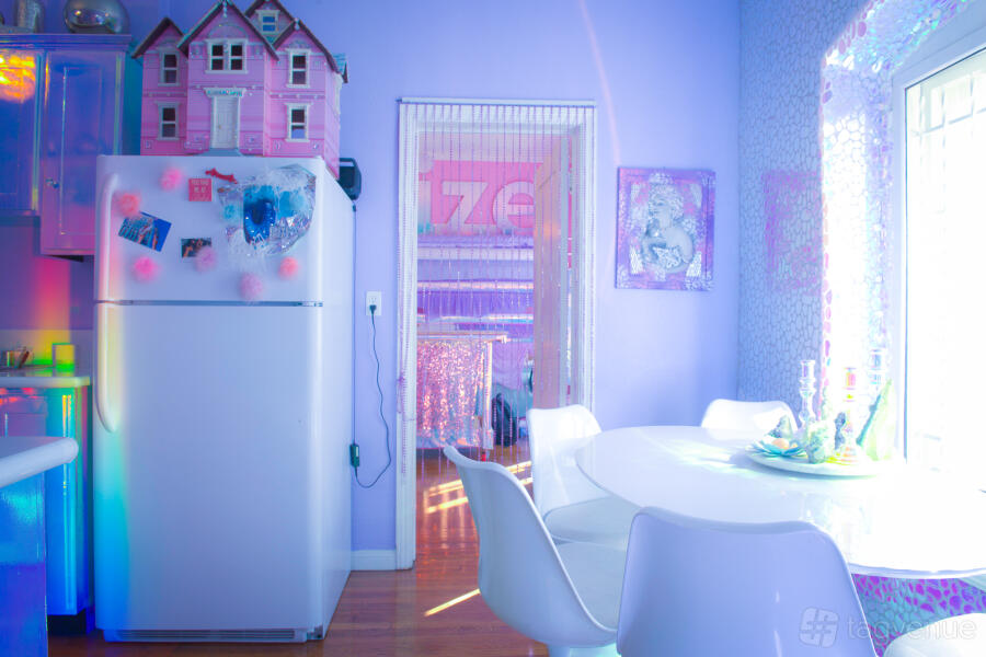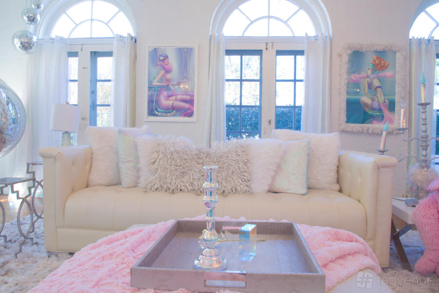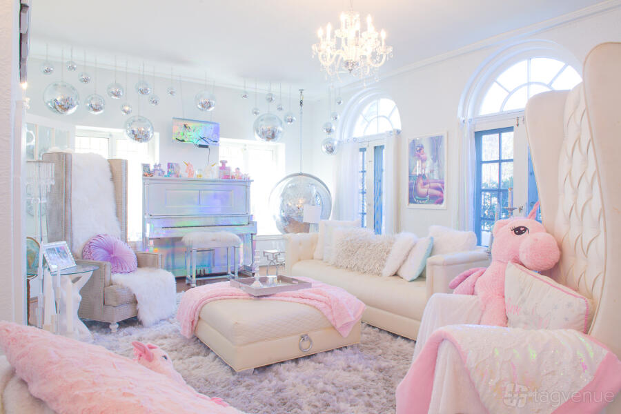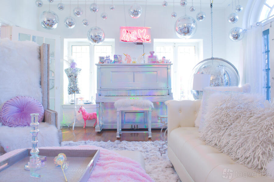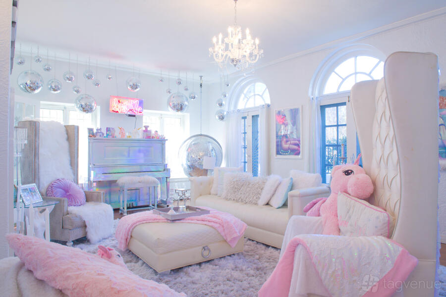 This room is fully stocked with three vintage double door arched windows with access to the outside patio. The patio is white with a pink cement floor. This room features an elegant living room with a beautiful couch, two princess chairs, and a Disco Ball floating chair. Also featured in this room in a Holographic Piano adorn with an entire sky of Disco Balls. In the center of the room is a beautiful faux fire place and gorgeous crystal chandelier above. The other side of the room featured light up pink "BEAUTY" letter and a white bar.