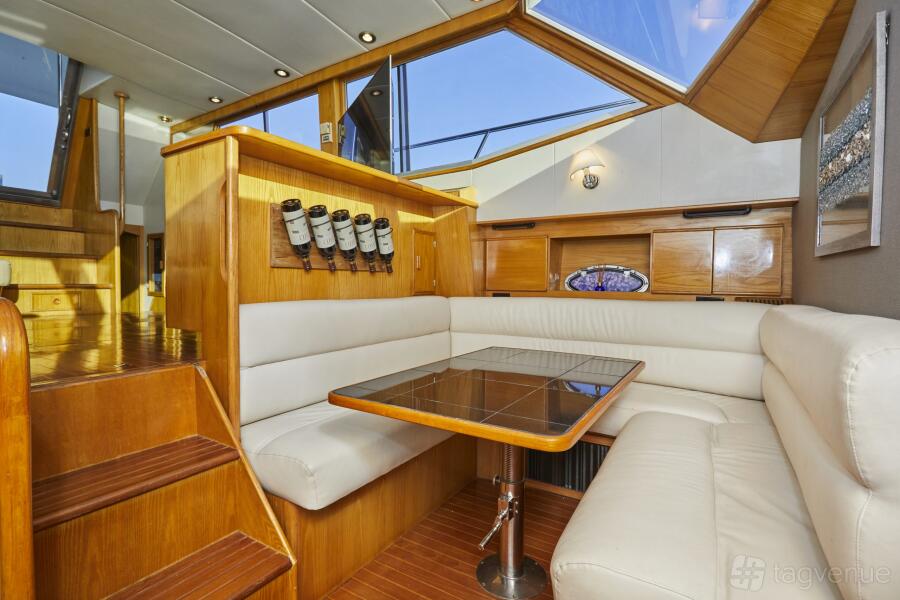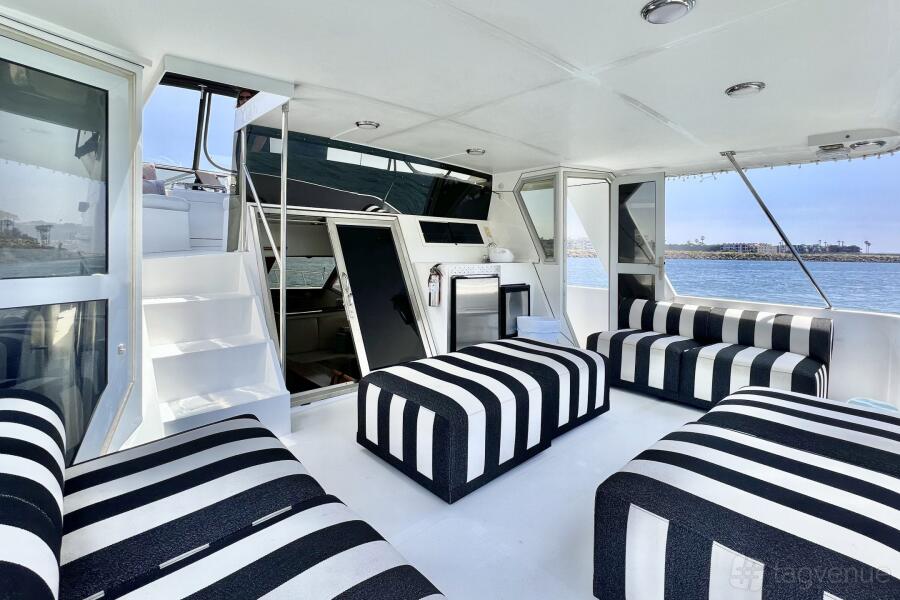 The exterior areas provide a large bridge with seating for the entire group surrounding a large open area commonly used as a dance floor, a bow with built-in bench seating for comfortably enjoying incredible views, and an aft deck with a barbeque grill.