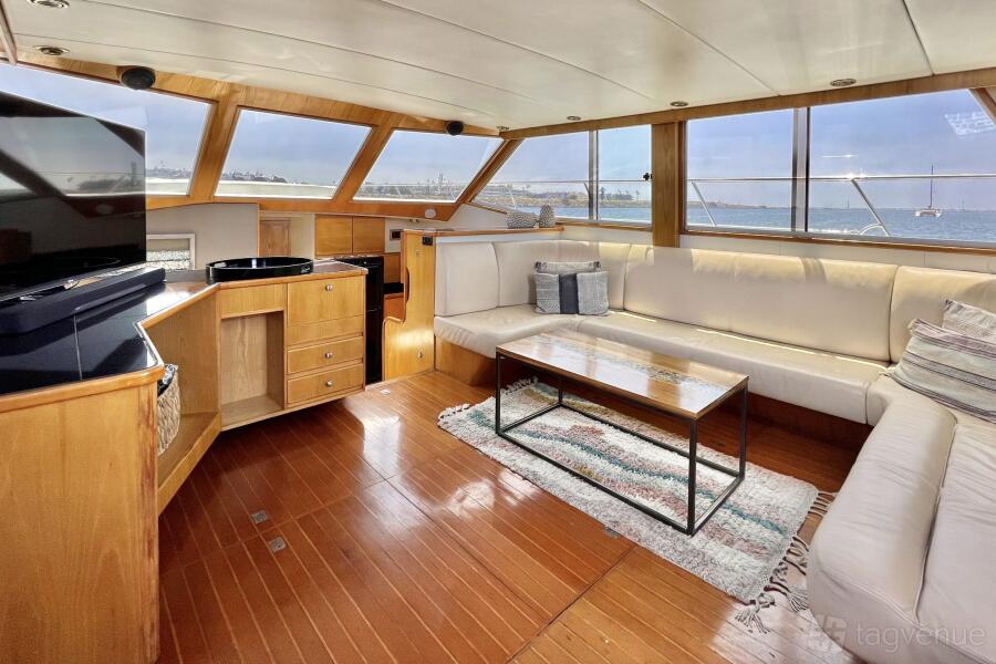 The interior salon offers a space to cruise in comfort with couches, chairs, and a fully equipped kitchen.