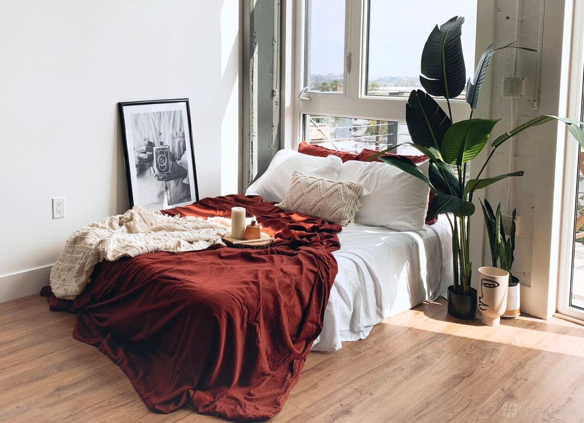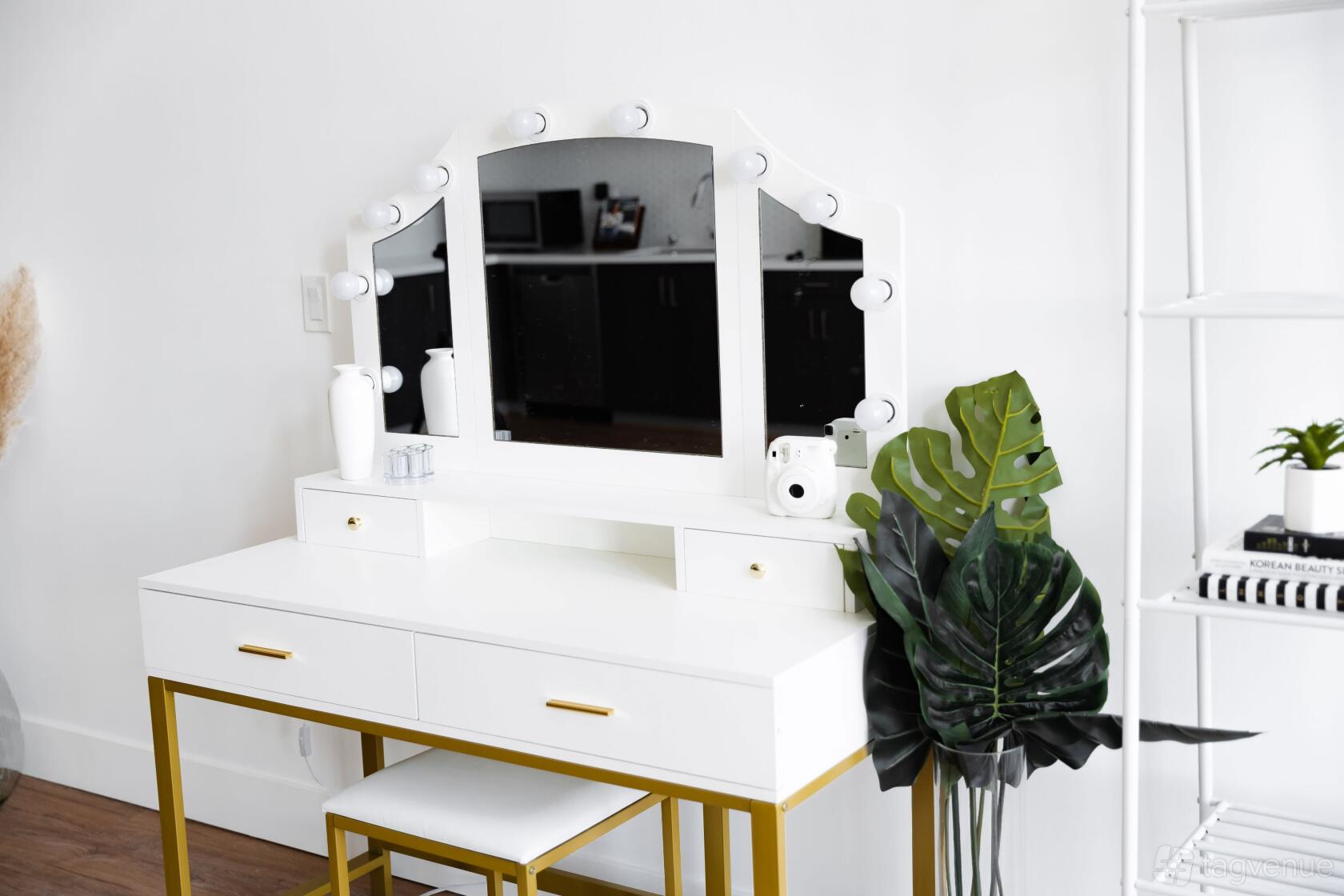 Our entire studio has 3 spacious rooms and 8 settings, including a living room, patio, rattan chair, vanity desk, a clothing rack, kitchen, bohemian bedroom, and bathroom.