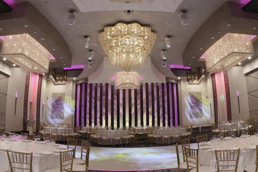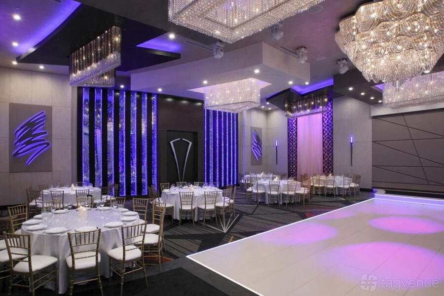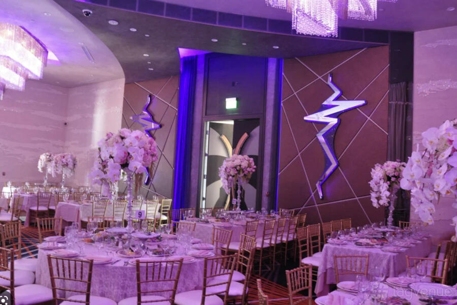 The massive Star Ballroom with breathtaking ambiance lighting, beautiful chandeliers, Fabric draped walls, and a grand dance floor, make this banquet hall perfect for a larger event such as a wedding, birthday party, graduation celebration, corporate Christmas party, or a charity event, as it can seat 450 guests.