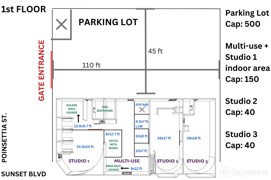 The venue is located in the heart of Hollywood and includes a massive parking lot, privacy, outdoor lighting customized to your brand/event, outdoor speakers and screens, dedicated studios complete with full lighting and additional spaces inside the building for activations throughout the event.