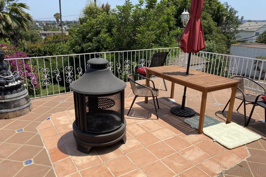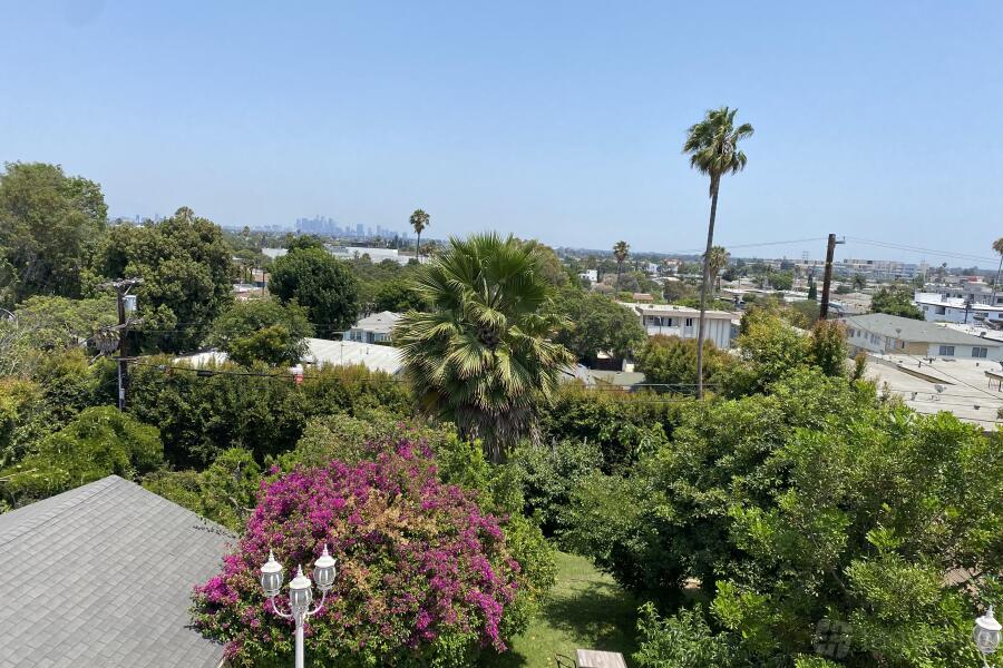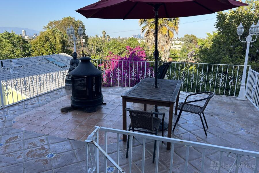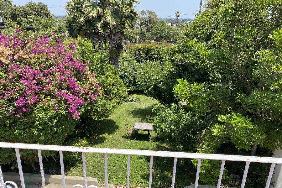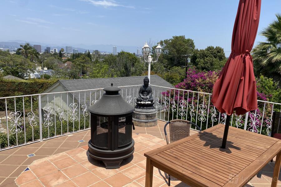 This charming outdoor area has huge fruit trees, a grassy backyard, and a vast balcony overlooking Beverly Hills, West Hollywood, Hollywood Hills, Downtown, Culver City, the mountains and even the Hollywood Sign!