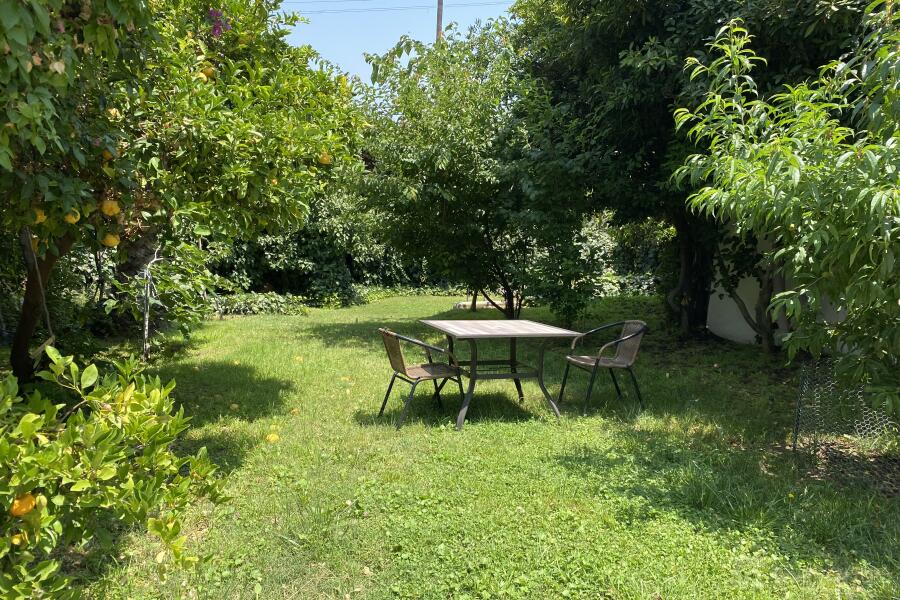 This balcony also has a view of the backyard with large fruit trees. There's a table for 6 people with a big umbrella, 4 beautiful old street lamps, and a fire pit.