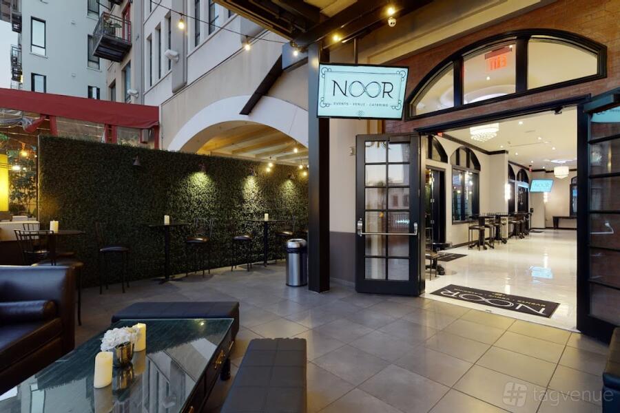 Immerse yourself in the enchanting atmosphere of NOOR's outdoor courtyard space, known as The NOOR Terrace. Nestled around a stunningly ornate fountain adorned with old-world trellis and cascading plants, this picturesque setting is perfect for private events.