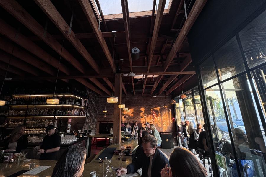 1.) The Bar -- a 1,500 square foot gastropub space complete with a uniquely wavy golden bar top. Natural skylights strike the interior, floor-to-ceiling windows open up to Abbot Kinney Boulevard. Ideal for cocktail-style parties and events.