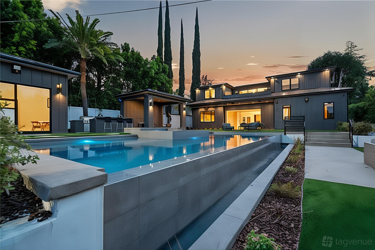 Lush, and a luxury playground in the Valley, the backyard showcases an infinity pool and spa with a waterfall feature, a fire pit area, a sports court, a putting green, and a summer kitchen. Whether relaxing in the open cabana with a built-in TV and heaters, or working out in the separate temperature-controlled ALQ (currently set up as a gym) with an attached three-quarter bath, escape to this Encino oasis and enjoy the serene Southern California setting.