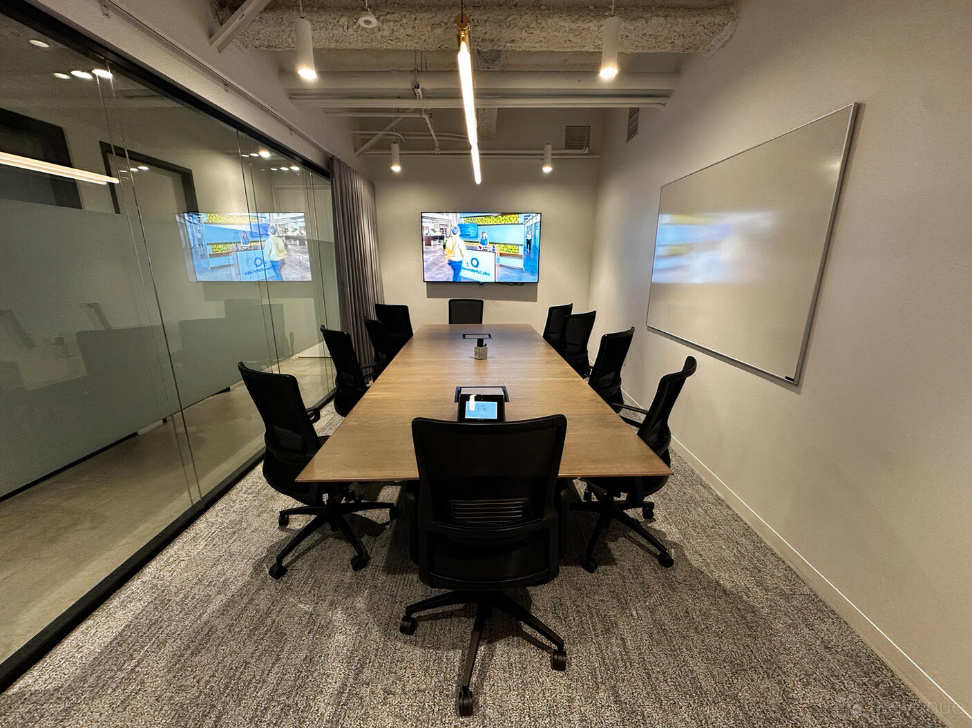 One end of the room features a large flat-screen TV, perfect for presentations or video conferencing. The space is well-lit with ceiling lights, creating an inviting ambiance without causing glare. Glass walls on one side of the room provide an open feel while maintaining privacy for confidential discussions.