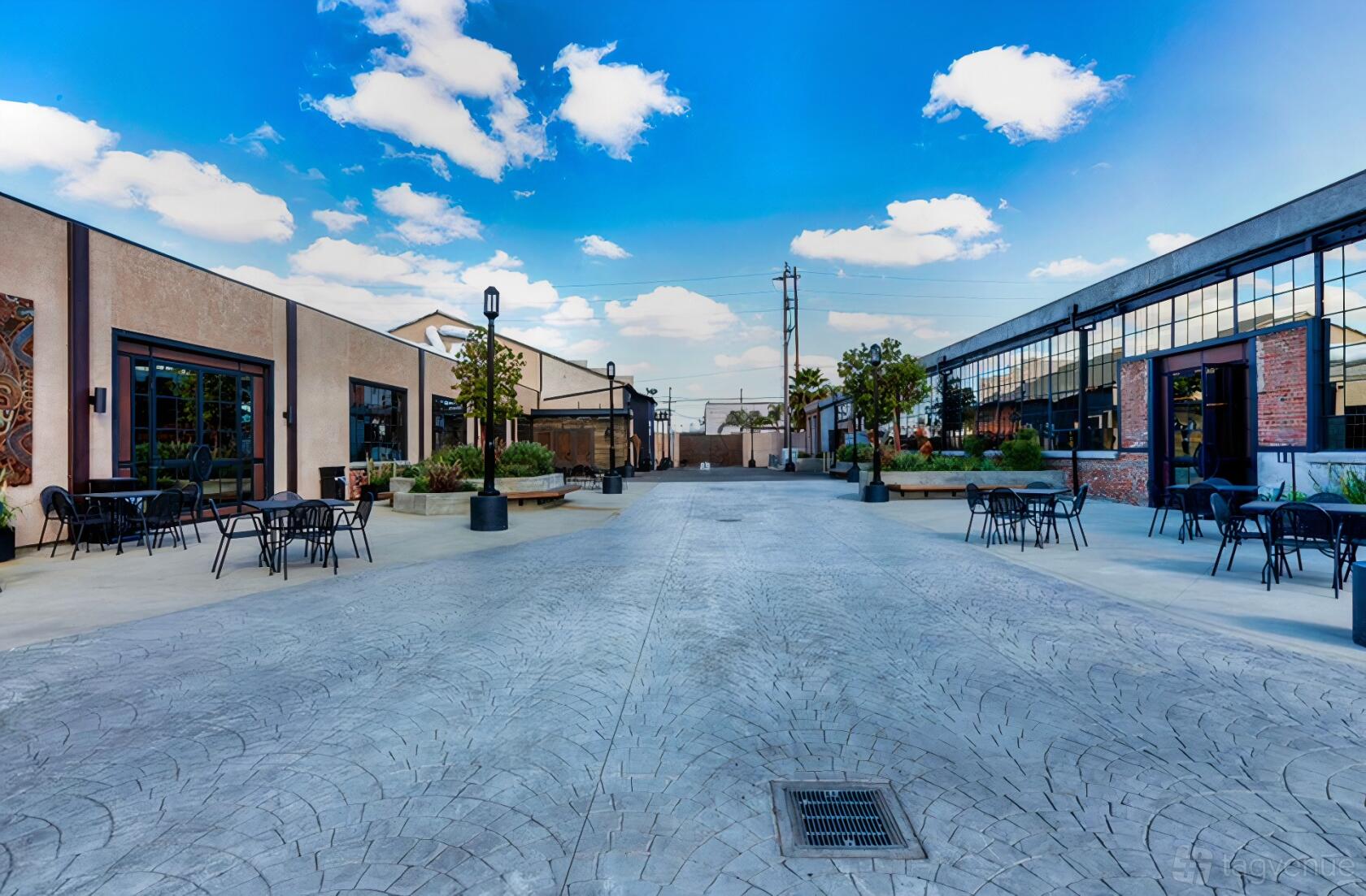 The 12,000-square-foot West Courtyard in South LA is a spacious outdoor plaza surrounded by modern low-rise buildings. It features patterned paving, street lamps for evening events, casual seating, and lush greenery. Ideal for community events, concerts, marketplaces, and company parties, it includes convenient bench seating.