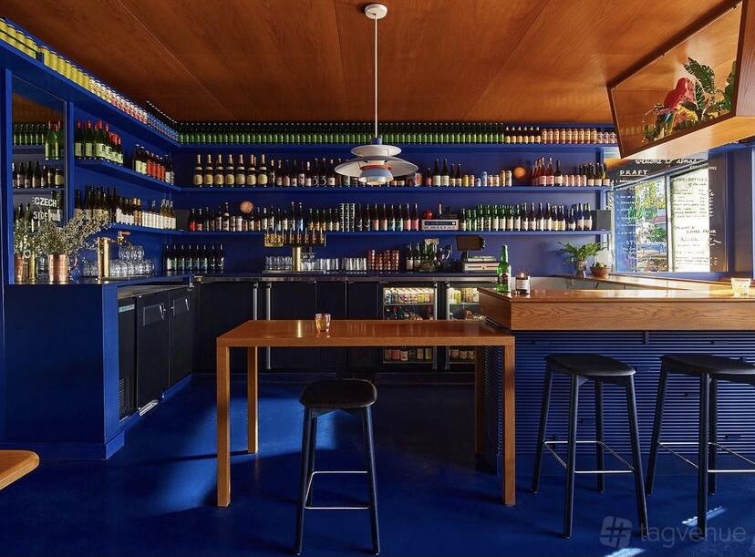 Alma's Cider & Beer is a newly built, modern bar located in Silver Lake, designed to create an intimate and atmospheric setting for productions and small gatherings. The interior is immersive, featuring rich dark blue tones accented with subtle gold details that lend a sophisticated and urban vibe.