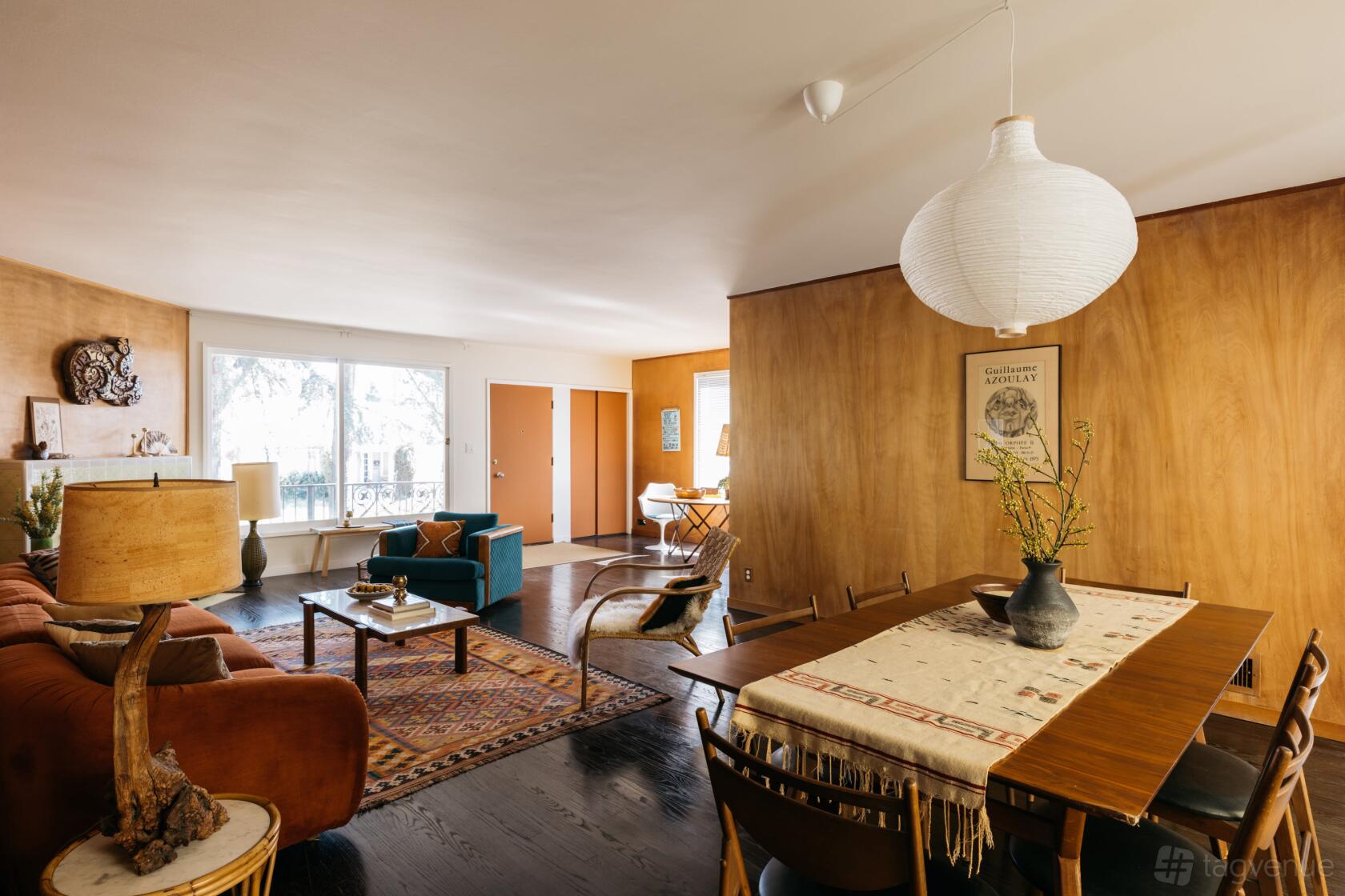 This mid-century modern home, built in 1950, is located at the base of the San Rafael hills in Eagle Rock, Los Angeles. Surrounded by large pines, the home features original wood-paneled walls and vintage bathrooms that have been well-preserved. The second bedroom includes wood paneling, an ensuite bathroom, and built-ins, while the third bedroom is spacious and accessible by a short set of steps.