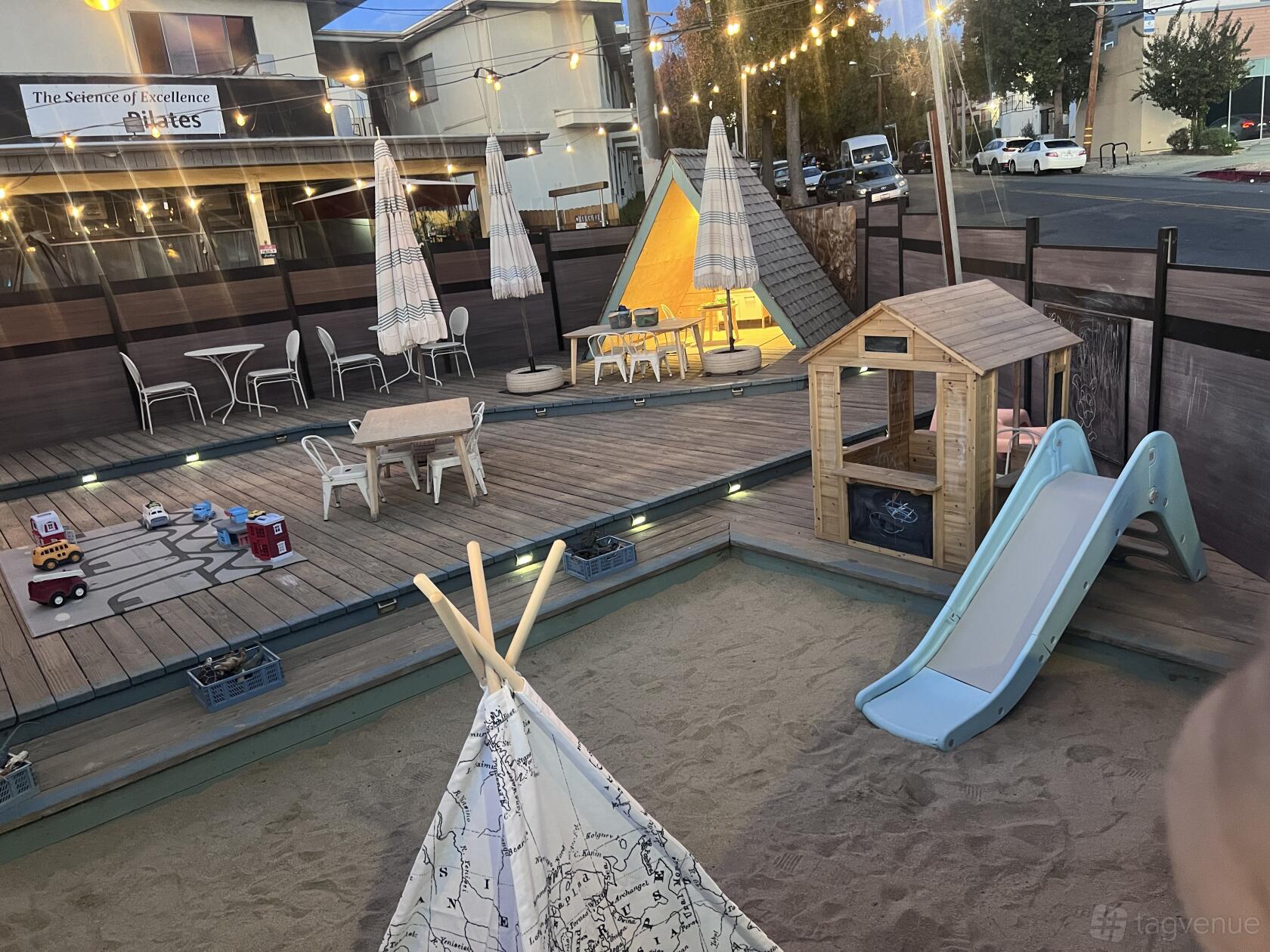 The outdoor area features a terraced deck, A-frame playhouse, and large sandbox, encouraging imaginative, hands-on play. With a wide assortment of toys and activities, the venue is ideal for hosting birthday parties and private events, creating an engaging atmosphere for children and their families.