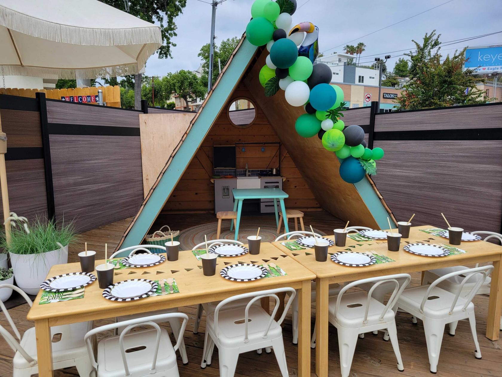 The outdoor area features a terraced deck, A-frame playhouse, and large sandbox, encouraging imaginative, hands-on play. With a wide assortment of toys and activities, the venue is ideal for hosting birthday parties and private events, creating an engaging atmosphere for children and their families.
