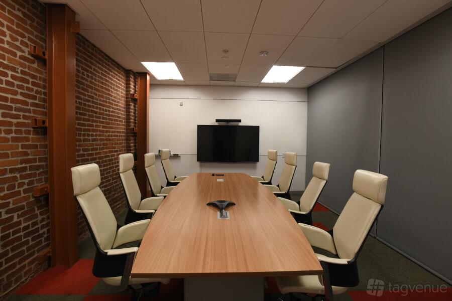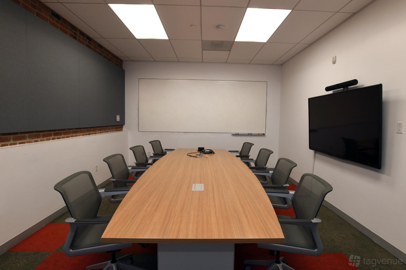 Conference Room 108 is a modern, 148-square-foot meeting space with a seating capacity of 8. It features a 65″ TV and a table equipped with HDMI connectivity for seamless presentations.