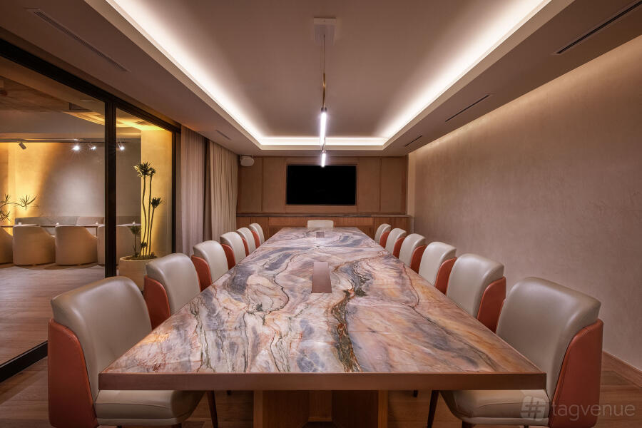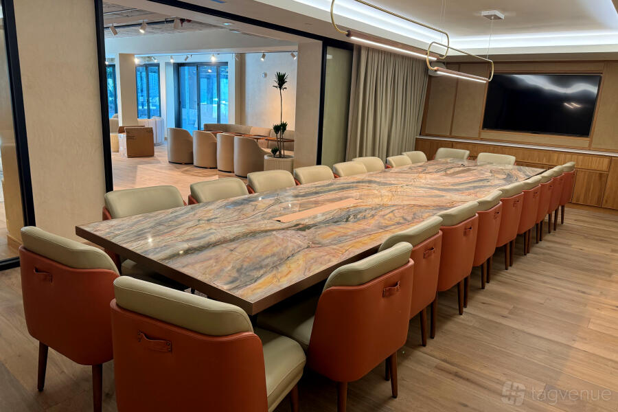 For more intimate gatherings or meetings, the boardroom offers seating for up to 20 people, equipped with an 80” monitor, HDMI, and outlets placed within the table. The boardroom’s glass pocket door allows for a connection to the lounge, making it ideal for events that require both a formal meeting space and a relaxed lounge atmosphere.