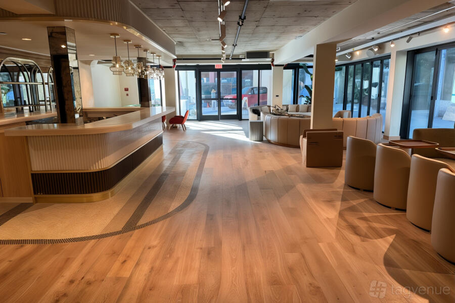 The Lounge and Boardroom offers a space with a capacity of 125 guests. It features accordion glass doors that open up to the outdoor space. With its sound system, oak wood floors, and organic finishes, the lounge sets the perfect vibe for pre- and post-event receptions, complemented by an espresso bar featuring Lamill Coffee.