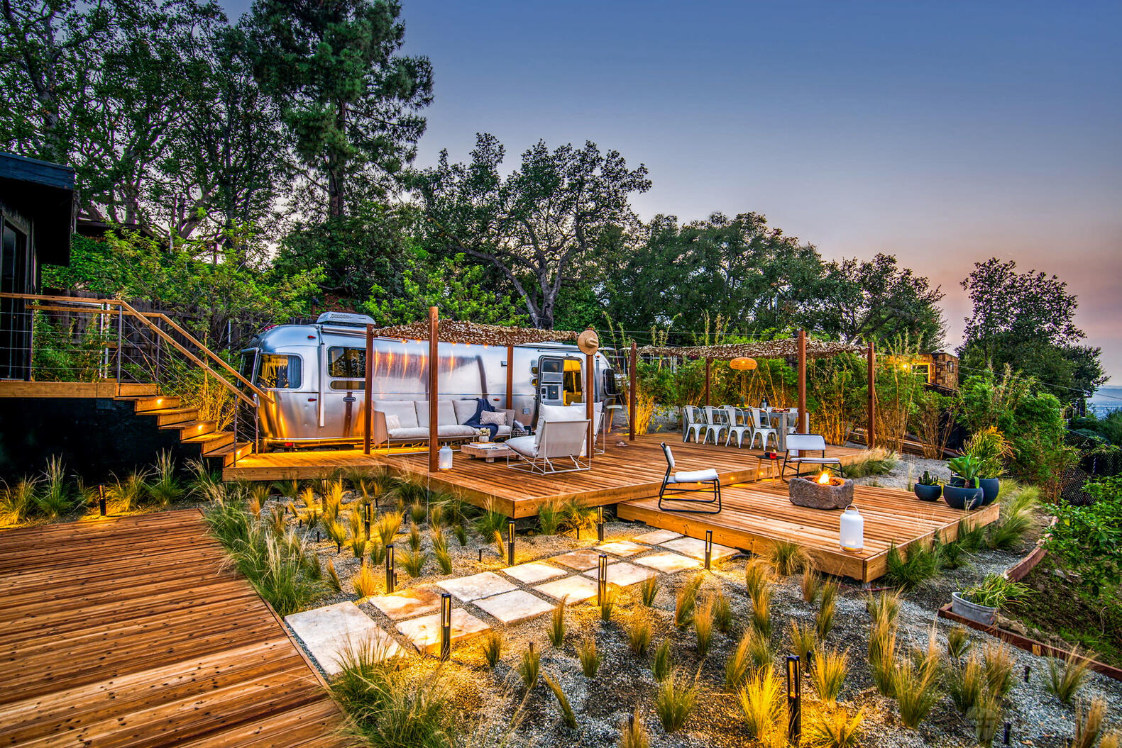 youRView, located at 7847 Torreyson Drive above Mulholland Drive, offers views of Hollywood and Universal Studios. This exclusive venue accommodates up to 25 people and features a 2021 Airstream, a 30'x15' luxury solar-heated pool, a deck with dining area, a bathroom with a steam room, and a fully equipped kitchen with a pizza oven.