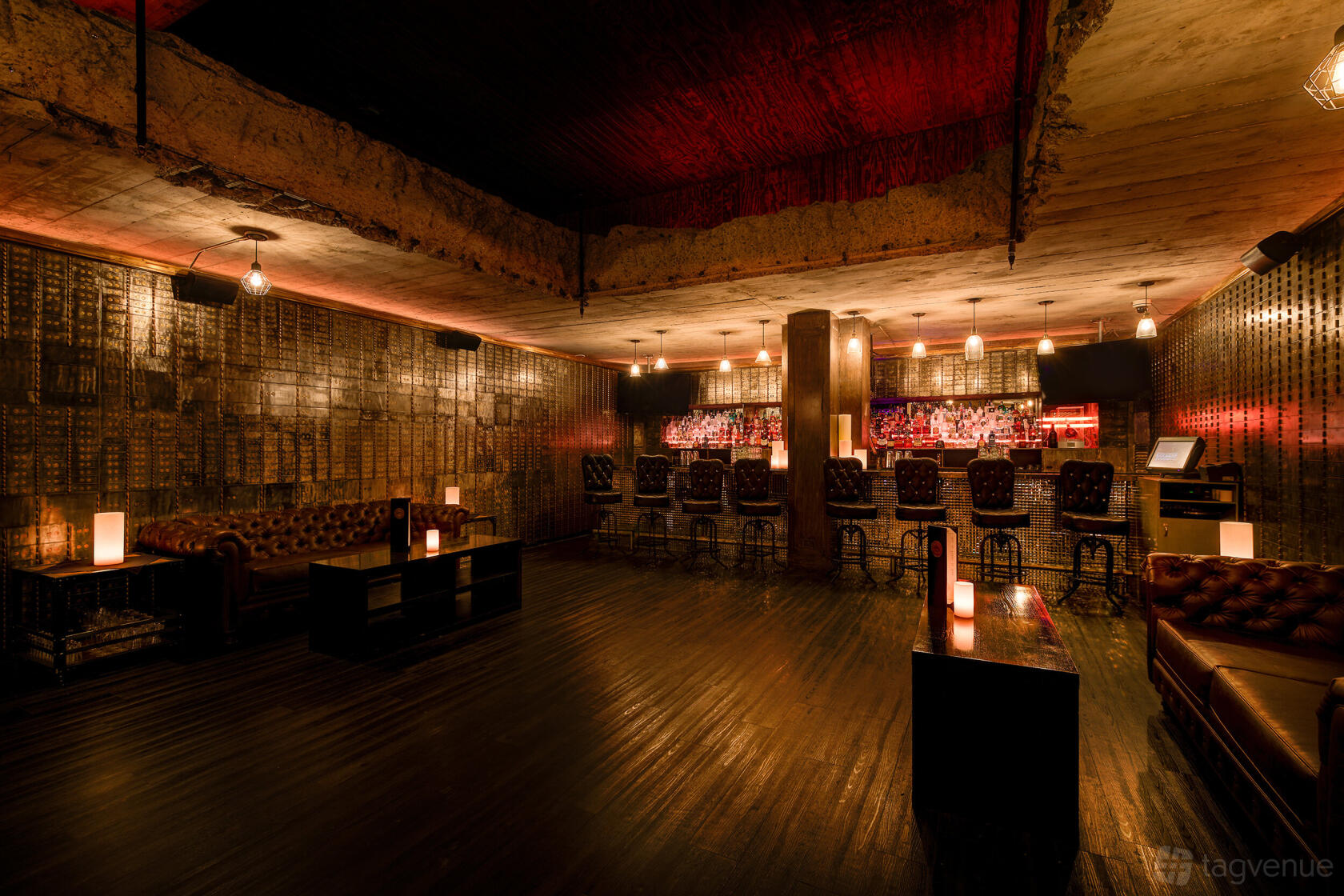 Key highlights include unique details like the teller’s booth and the repurposed vault, which add a touch of vintage luxury. The bar, designed with classic charm, enhances the space’s inviting and high-end feel. Dim lighting and plush seating make the space comfortable and ideal for private events, from parties and cocktail receptions to networking meetups and celebrations.