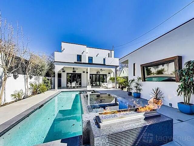 Host friends and family in the private guest house, which includes its own kitchen and a separate entrance leading to a patio with a luxurious pool, jacuzzi, outdoor movie theater, and fire pit.
