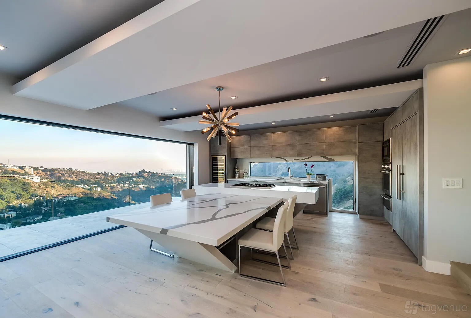Your eyes can't help but be drawn to the stunning LA skyline, framed by the floor to ceiling window walls. Light hardwood flooring & frameless glass paneling, pair effortlessly with the chic white & charcoal furnishings. Coupled with liner fireplaces, backlit ceiling beams, and state of the art technology, this home is the peak of modern luxury. This property is integrated with a Control 4, smart-home system. Control the entertainment content, 35-speaker surround sound system, LED scene lighting, temperature, and security system, from anywhere in the world with your Control 4 application. With new stainless steel appliances, a chilled wine closet, ample counter space, and a large island, this bright & fresh kitchen is every chef's dream.
