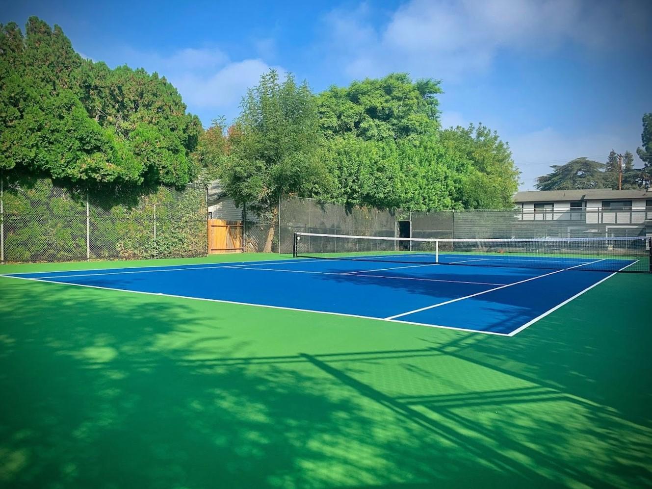 The tennis court looks out at 2,500 square feet of beautiful, lush, green grass. The space is surrounded in trees, foliage, and bushes, making it an absolutely perfect place to host team building, tournaments, filming, and more!
