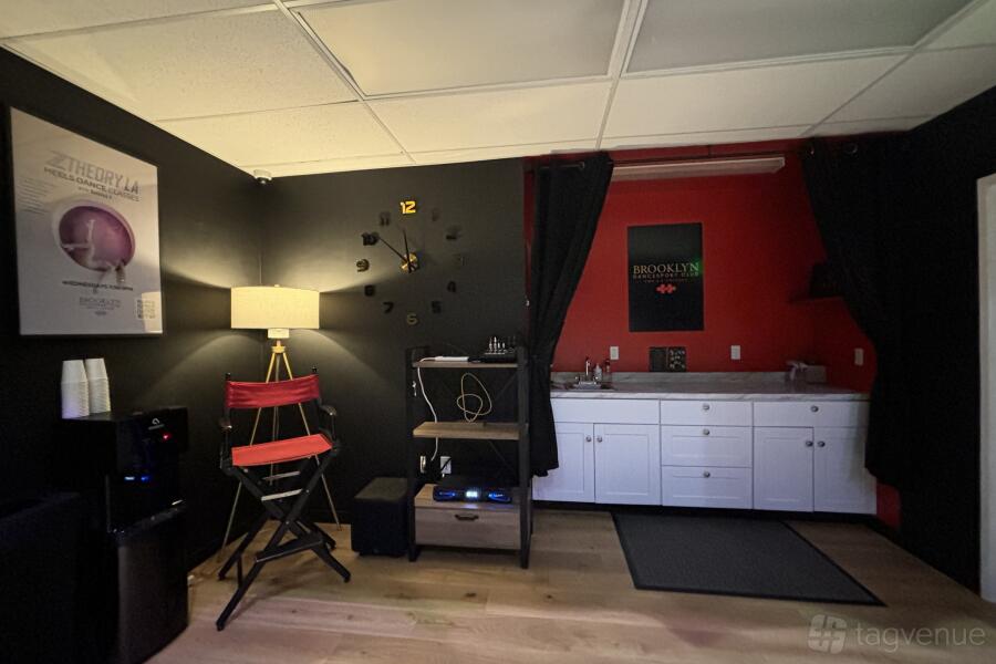 This is a beautiful 6,500 sq ft room with vaulted 20 ft ceilings. It has an extensive lighting grid which houses LED as well as RYG lighting and also has dimming capability. Interior walls have all been painted black to give it a plane and blacked out look. The space also boasts a full JBL sound system and has an additional PA system attached for a full sound experience