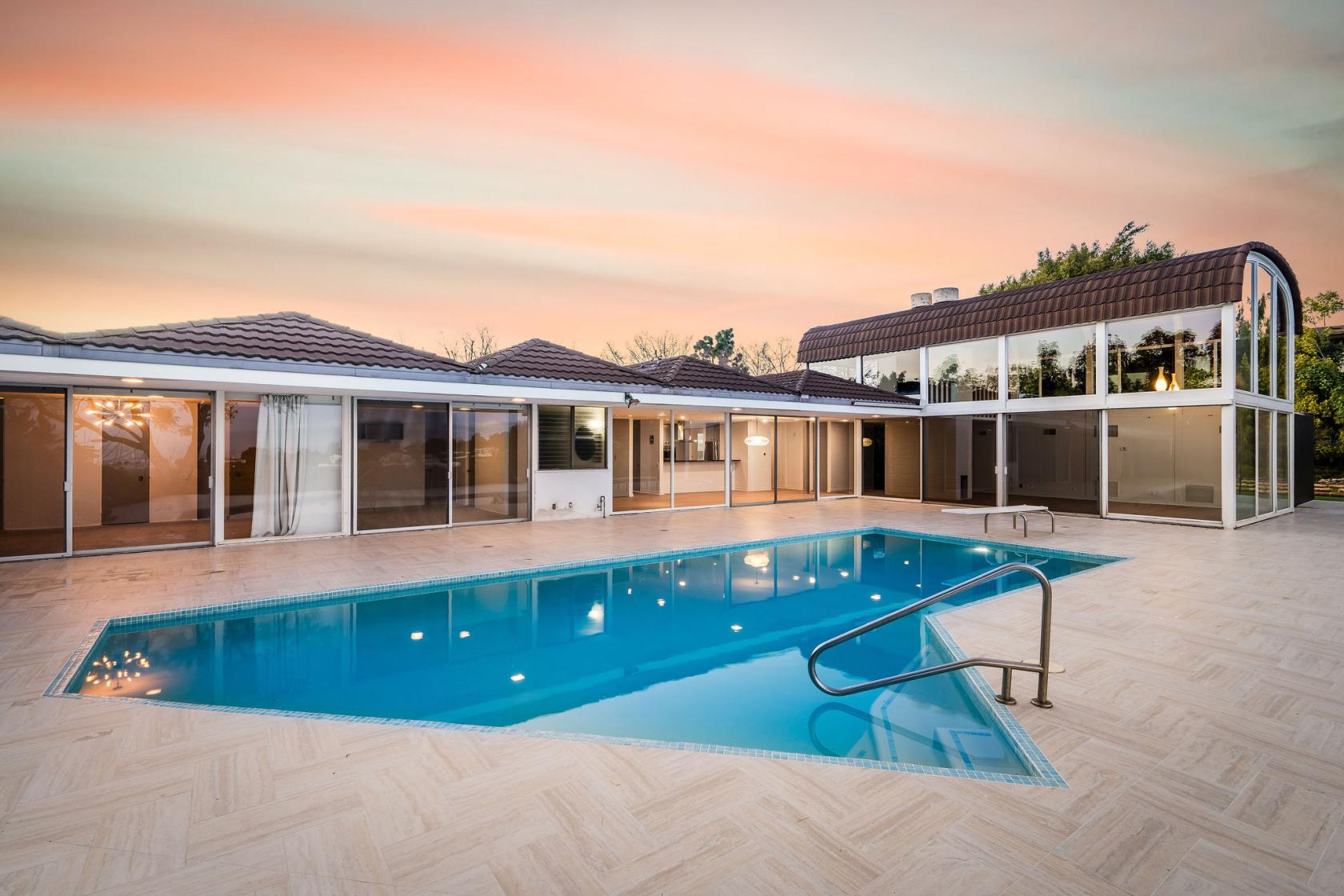 Bel Air house with stunning city views, heated pool, and pickleball court! This rare property offers a panoramic backdrop, a grassy area connecting to the court, and a classic diving board.