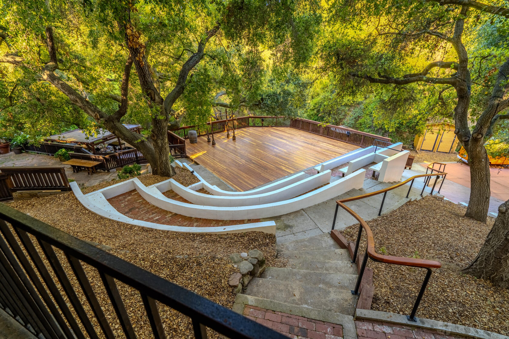 This venue features a Dance Hall with 4 hanging chandelier lights, custom wooden beams, 9 French doors, 2 custom-built bars, and custom ballroom flooring, and a Banquet Hall, offering 39' x 36' of open space with high ceilings surrounded by nine french doors on three sides, allowing plenty of natural light and air in. Some of its main areas include The Ceremony Deck (Amphitheater Style Seating) under the shadow of two oak trees, ideal for wedding ceremonies or intimate receptions, and The Meadow, with over 6000 sq. ft. of real grass.