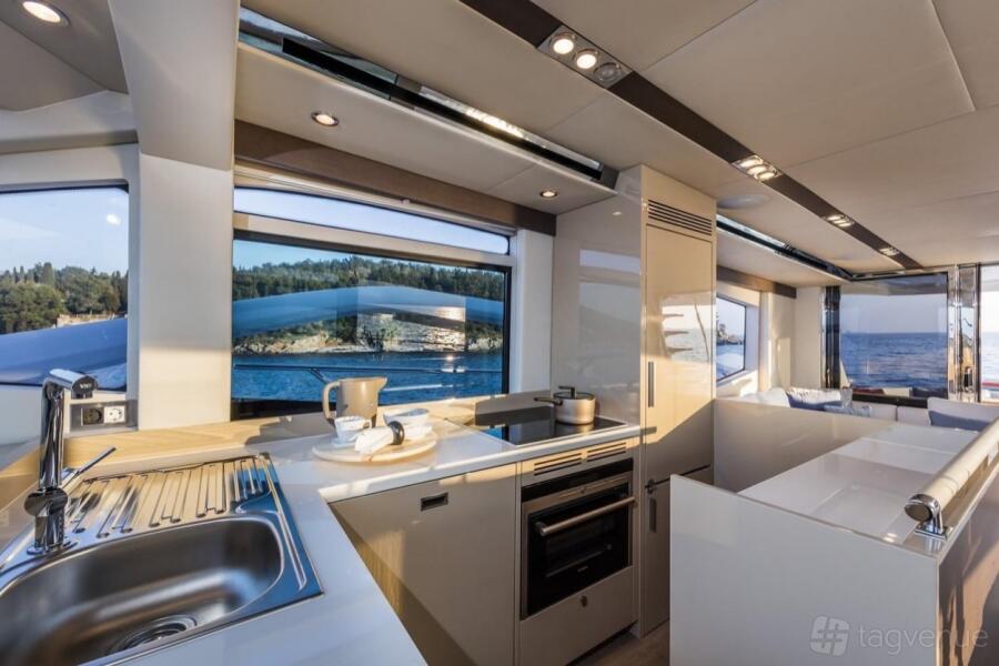 The main cabin includes starboard side helm with a large dinette station aft of it. The port side features seating with dining table, the perfect place to enjoy a cool beverage in the shade. A little further back, there is a rear-facing single seat on each side of the yacht, and a small aft bimini which provides more shade for guests. The spacious cabin area has an L-shaped sofa and flat screen tv on the port side, where you can enjoy a nice meal with family and friends. Meals can be easily prepared using the galley's full set of appliances. The Austin Parker features a forward V-berth stateroom. She also includes two heads with showers and plenty of wardrobes and drawers.