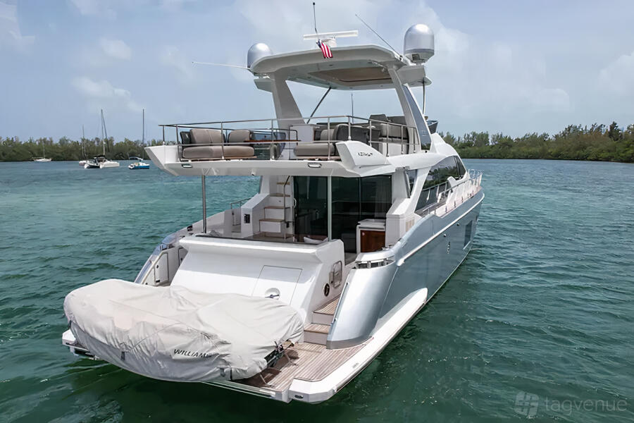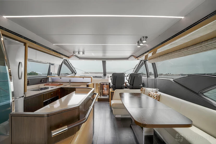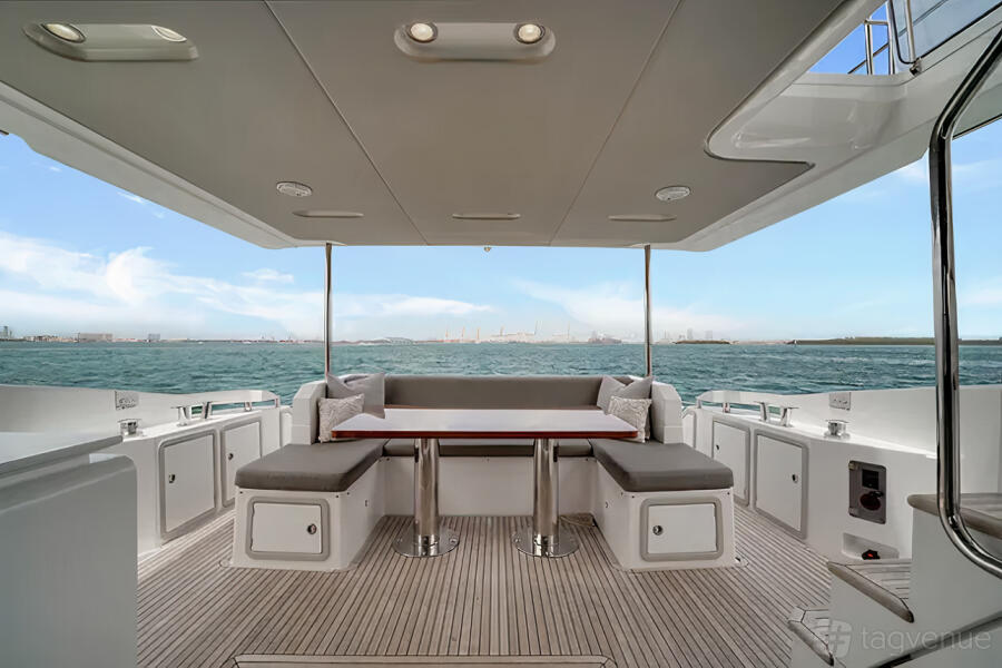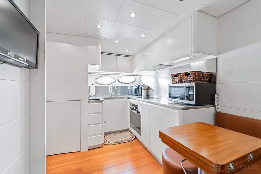 As the sun dips below the horizon, savor the breathtaking views from the contemporary seating area, specially designed for comfort and style. Additionally, the yacht features a fully-equipped kitchen, allowing for the preparation of gourmet meals or the perfect cocktail to enhance your on-water experience.