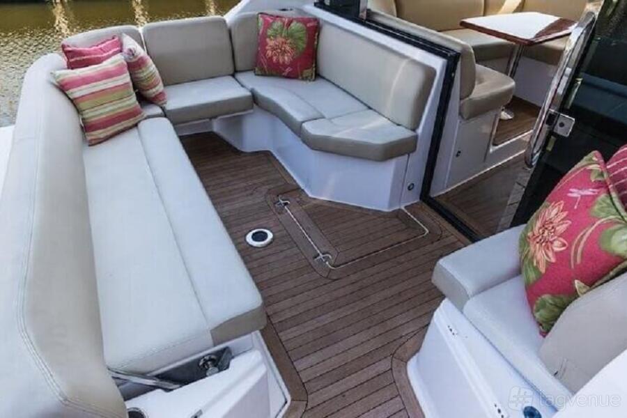 Step into the heart of luxury aboard the Numarine 65ft charter yacht, where the main cabin and cockpit area redefine elegance with their seamless blend of comfort and style. Surrounded by expansive windows, this space is bathed in natural light, offering guests captivating views from every angle.