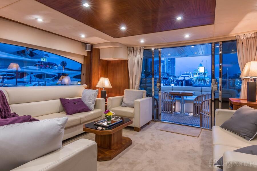 With a maximum capacity catering to 12 guests, the 65' Azimut Yacht ensures an intimate and exclusive experience for all aboard. The deck's thoughtful layout accommodates various preferences, from ample loungers for sunbathing to an outdoor dining table, as well as panoramic views from deck chairs. This versatile design ensures that guests can indulge in their preferred activities while enjoying the serenity of the water.