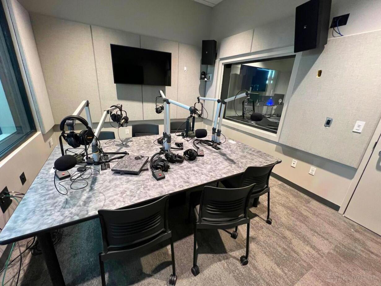 Discover our professional podcast studio, equipped with a central table, comfortable chairs, high-quality microphones, headsets, and a camera for recording. Designed for seamless audio production and video production, it offers a comfortable and efficient space for creators to bring their ideas to life.
