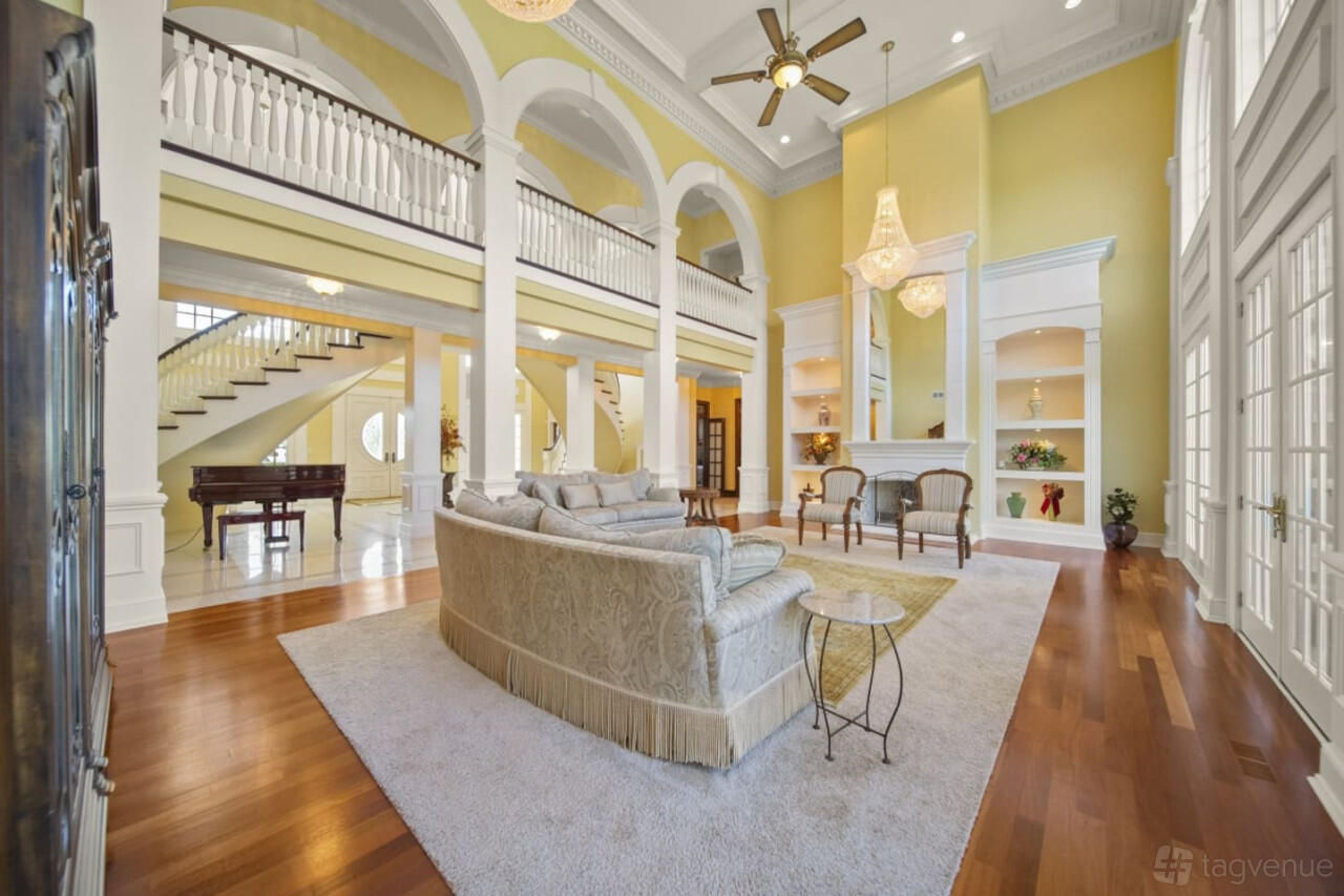 The grand foyer opens to high ceilings and light-filled rooms, with large windows showcasing views of the upper and lower heated pools connected by a cascading waterfall. The home includes a fully equipped kitchen, a formal dining room, and cozy living spaces, including one by the fireplace.