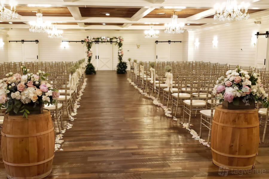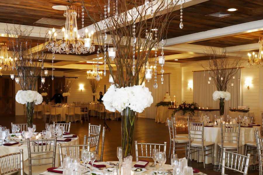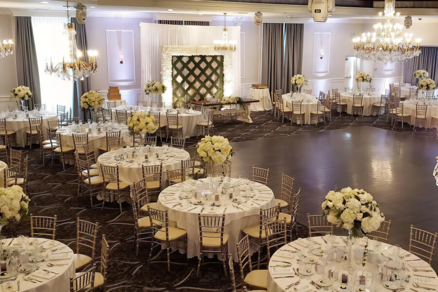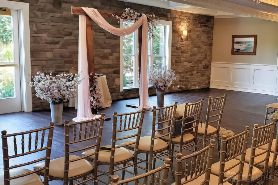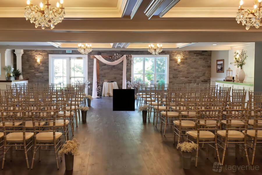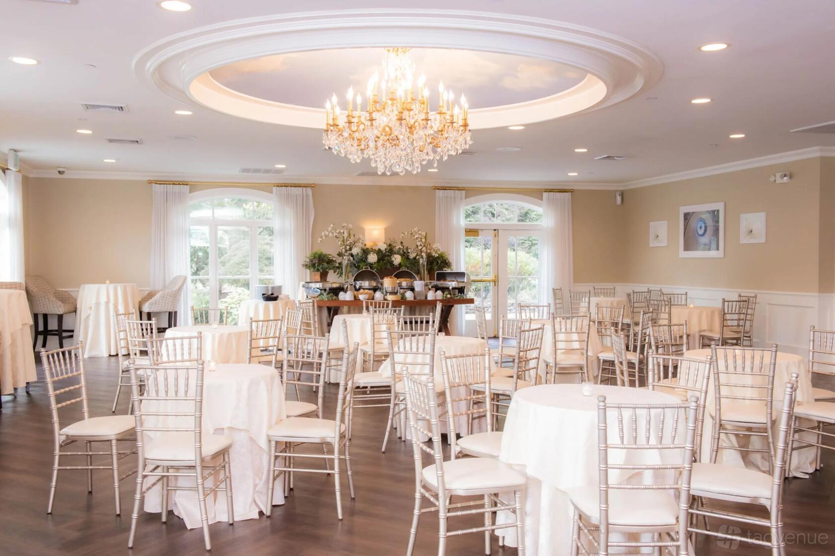 The venue can accommodate 90 people. The beautiful look of the venue is the outcome of the great balancing act of hardwood that is dark and walls that are light. The huge round windows and the sliding glass doors are the factors that not only allow the room to be bright but also bring in the view of the outdoors that is full of trees. The ceiling is round and has a main chandelier that gives the area not only height but also the charm. Recessed lighting and wall sconces are working together to give light that is evenly spread out in the room. The arrangement is open and flexible.
